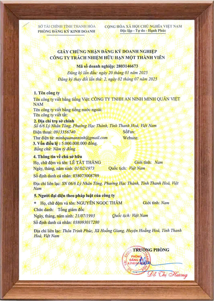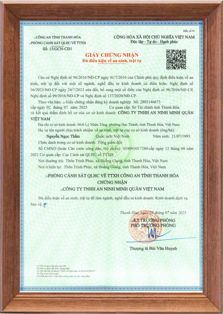 Công ty TNHH an ninh Minh Quân Việt Nam là đơn vị cung cấp dịch vụ bảo vệ an ninh chuyên nghiệp, với đội ngũ nhân viên được đào tạo bài bản về kỹ năng nghiệp vụ và quản lý tình huống. Mục tiêu của công ty là đảm bảo an toàn tuyệt đối cho khách hàng, tài sản, và môi trường làm việc